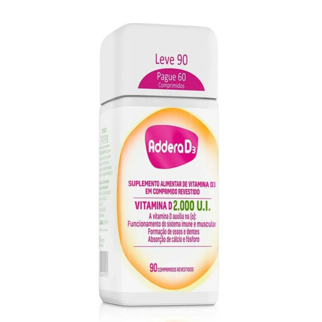 Addera D3 2000UI com 90 comprimidos revestidos é um suplemento de vitamina D3 que auxilia na absorção de cálcio, fortalecimento dos ossos e suporte ao sistema imunológico. Ideal para manter níveis adequados de vitamina D no dia a dia.