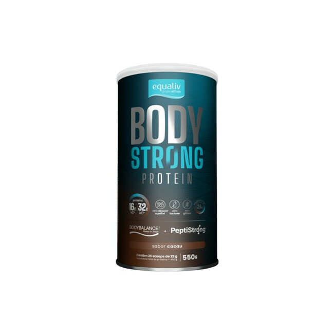 O Equaliv Body Strong Protein (Cacau) é um suplemento proteico de 550g que combina peptídeos bioativos de colágeno (BodyBalance®) e peptídeos de fava (PeptiStrong™). Com 16g de proteína por dose, o produto é formulado para auxiliar no ganho de massa magra, aumento da força muscular e recuperação pós-treino, sendo uma alternativa sem leite, sem glúten e com baixa caloria.