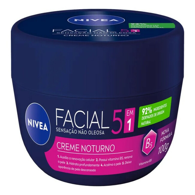 Desperte com uma pele renovada e radiante com o Creme Facial Nivea Noturno. Sua fórmula de rápida absorção, enriquecida com Vitamina B5, hidrata profundamente e estimula a renovação celular enquanto você dorme. Ajuda a recuperar a pele do estresse diário, deixando-a mais macia, suave e com aparência saudável pela manhã.