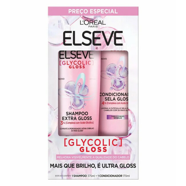 O Kit Elseve Glycolic Gloss Shampoo 375ml + Condicionador 170ml promove limpeza profunda, alinhamento dos fios e brilho intenso, ajudando a reduzir a porosidade e deixar o cabelo mais macio, sedoso e luminoso desde o primeiro uso.