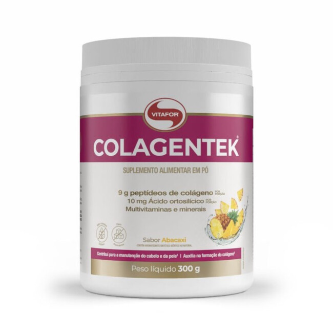 Peptídeos de Colágeno Hidrolisado Colagentek Vitafor Abacaxi (300g) auxiliam na saúde da pele, unhas, cabelos, articulações e ossos, com alta absorção e sabor agradável.