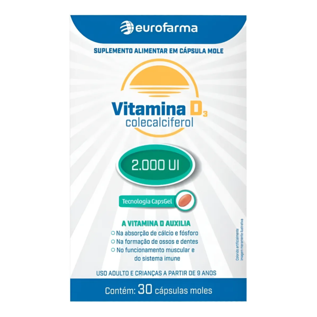 A Vitamina D3 2.000 UI (30 cápsulas gel) é um suplemento alimentar que auxilia na absorção de cálcio e fósforo, promovendo fortalecimento de ossos e dentes, além de contribuir para o funcionamento saudável do sistema imunológico.